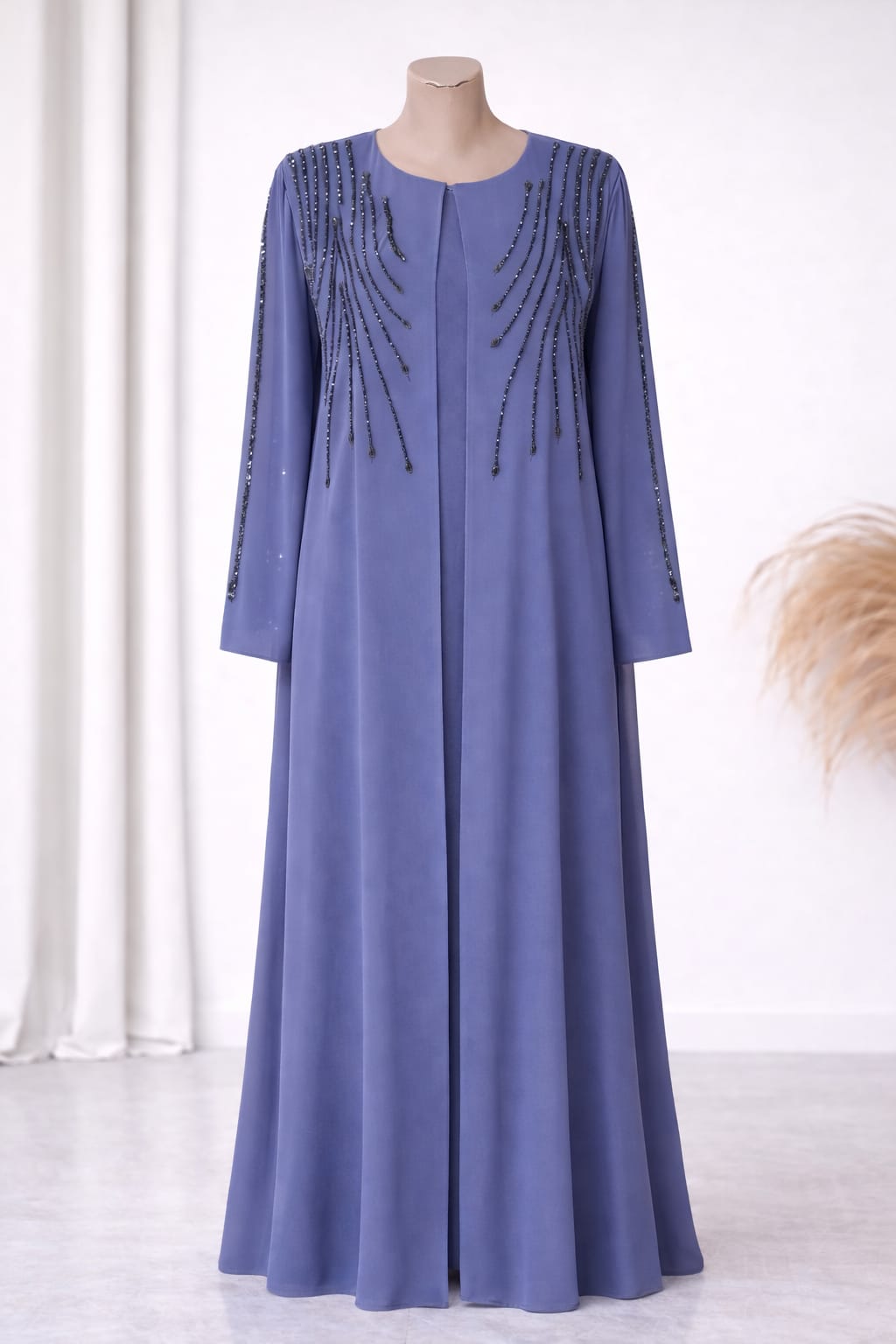 Elegantna duga haljina u nježnoj plavoj boji, ukrašena diskretnim sjajnim detaljima na prednjem dijelu i rukavima. Lepršav kroj sa dodatnim ogrtačem daje sofisticiran i profinjen izgled, idealan za svečane prilike.