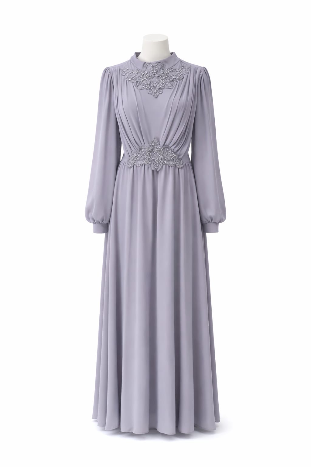 Elegantna duga haljina u nježnoj sivo-lila nijansi, ukrašena profinjenim perlama i detaljima na gornjem dijelu i struku. Lagano padajući kroj i sofisticiran dizajn čine je savršenim izborom za posebne prilike, pružajući spoj elegancije i udobnosti.