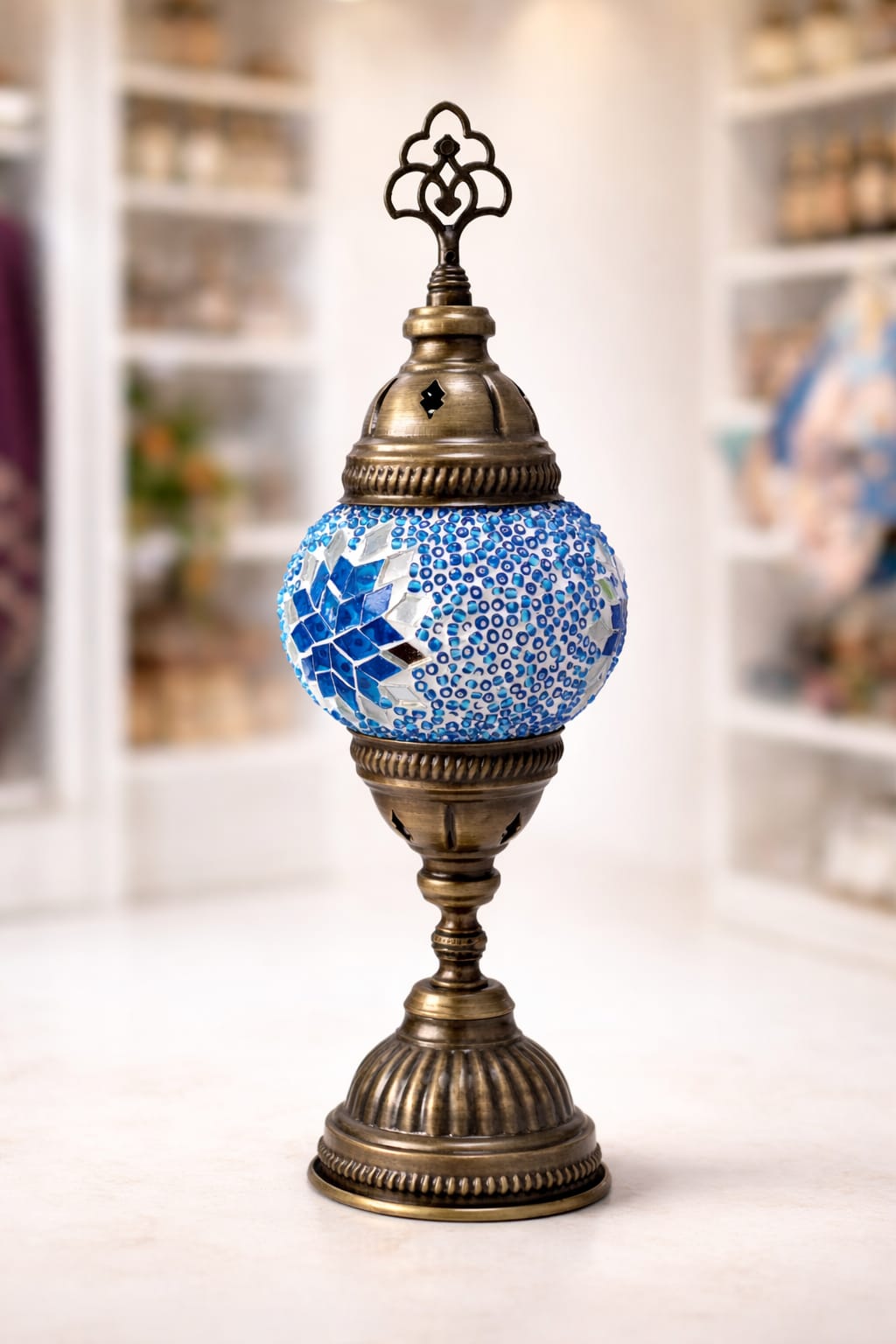 Elegantna orijentalna lampa izrađena od kvalitetnog metala i ručno složenog mozaik stakla u plavim i bijelim tonovima. Njen prepoznatljiv dizajn donosi toplu i ugodnu atmosferu u svaki prostor, stvarajući poseban ambijentalni ugođaj. Detaljno obrađena baza u zlatnim nijansama dodatno naglašava luksuzan izgled, dok unikatni uzorci svjetlosti daju prostoru dozu egzotike i elegancije. Idealna je kao dekorativni element za dnevni boravak, spavaću sobu ili poslovni prostor.