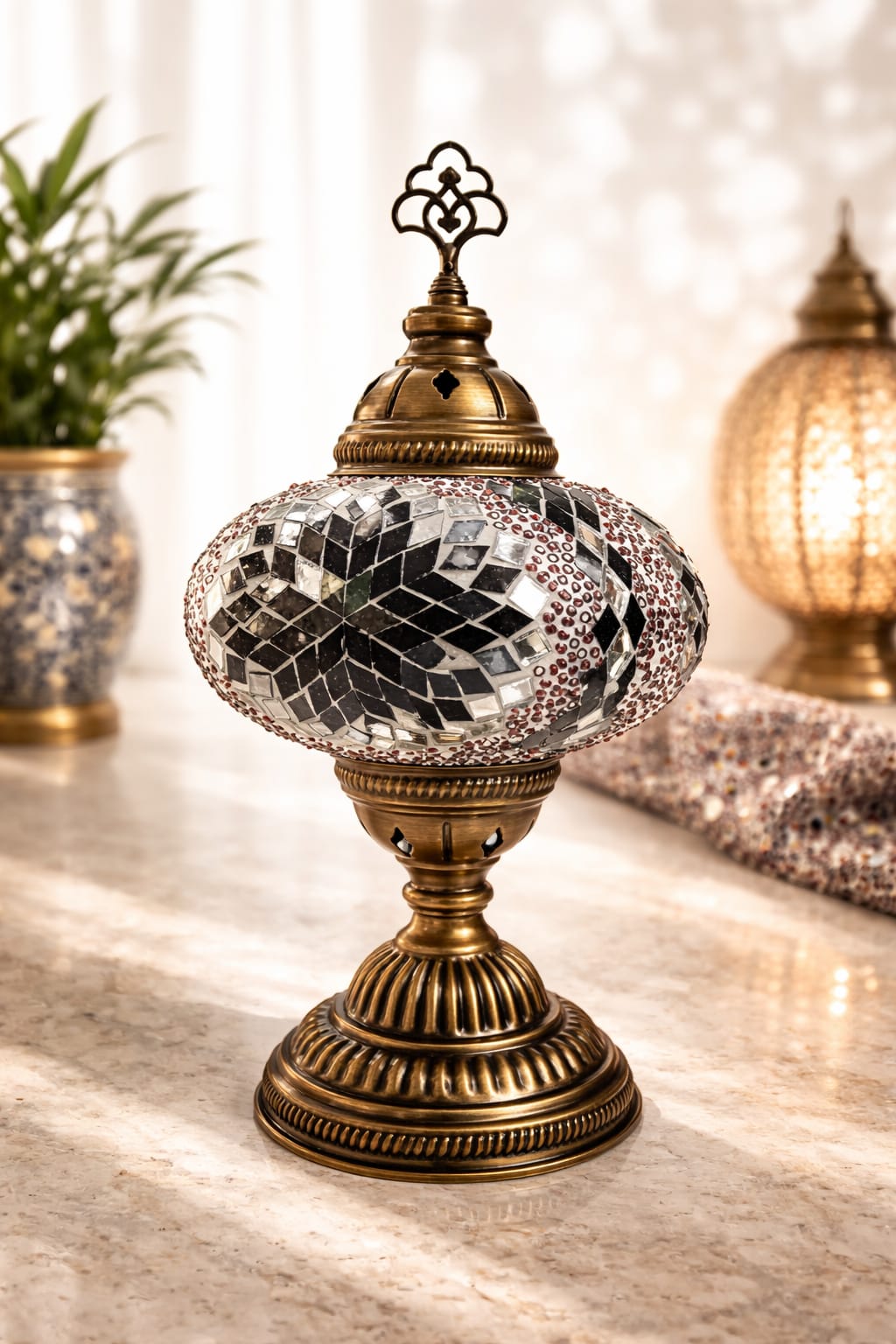 Elegantna ručno rađena lampa sa mozaik staklom u različitim tonovima, koja stvara toplu i ugodnu atmosferu. Vintage metalno postolje i autentičan dizajn čine je savršenim dekorativnim dodatkom za svaki prostor.