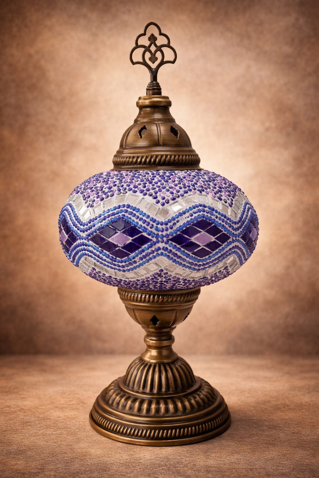 Elegantna orijentalna lampa sa ručno rađenim mozaikom u plavo-bijelim tonovima i metalnim postoljem. Unosi toplinu i poseban ambijent u svaki prostor.